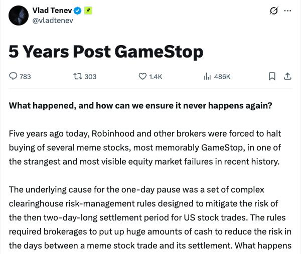 In a Wednesday post on X, Tenev characterized the 2021 GameStop trading halt as "one of the strangest and most visible equity market failures in recent history," attributing it to complex regulations tied to the two-day settlement timeline that was standard for stock transactions during that period.