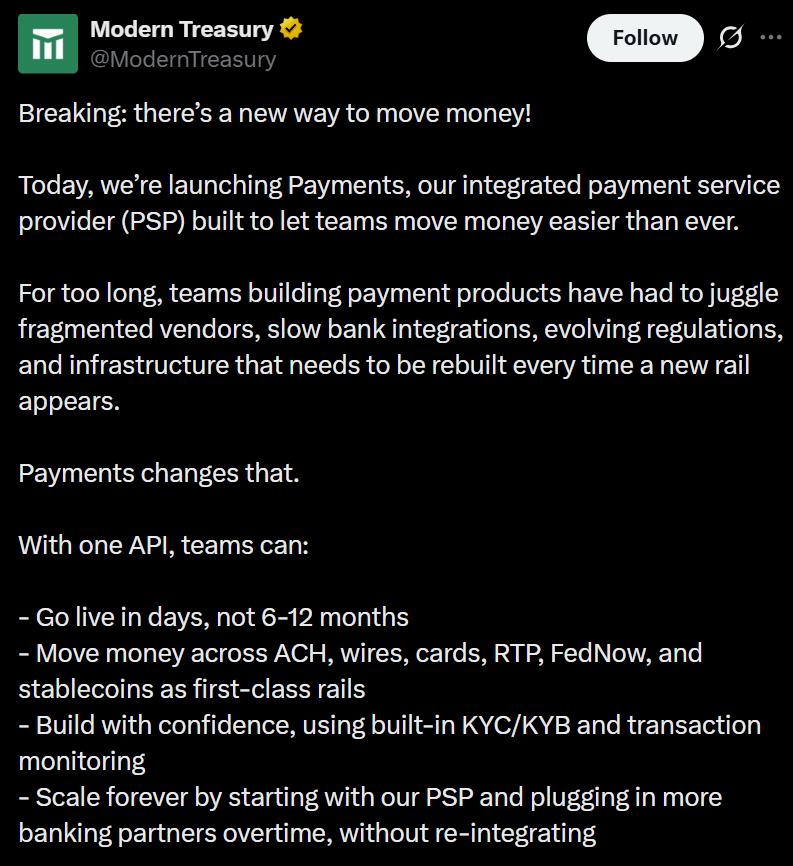 A payment operations software company called Modern Treasury, which specializes in helping businesses manage and reconcile the movement of funds, has launched an integrated payment service provider (PSP) offering support for both conventional fiat payment rails and digital stablecoins.