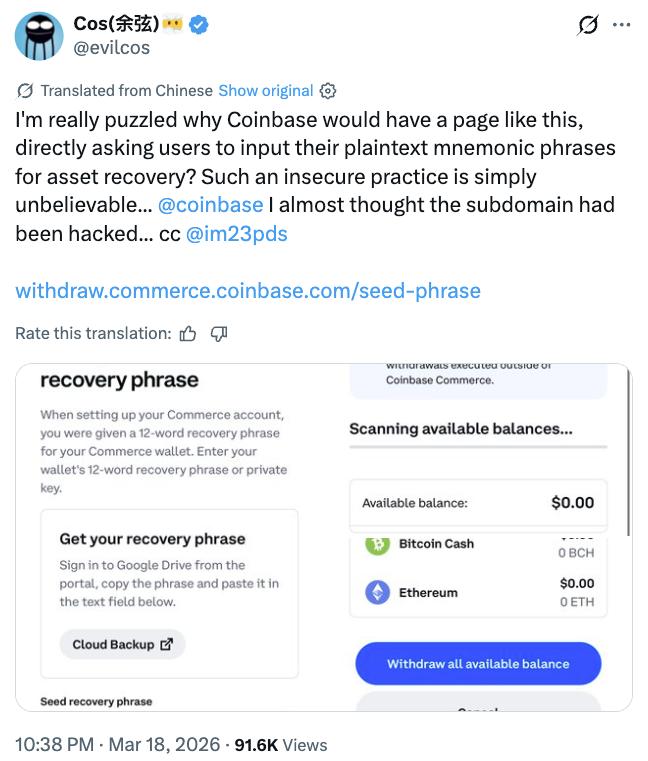 "I'm really puzzled why Coinbase would have a page like this, directly asking users to input their plaintext mnemonic phrases for asset recovery," Yu wrote in an X post on Wednesday, adding: "Such an insecure practice is simply unbelievable."