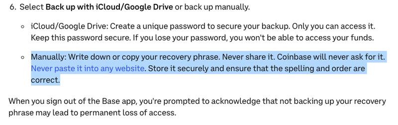 In a separate help article, Coinbase explicitly recommends that users should under no circumstances enter seed phrases into any website.